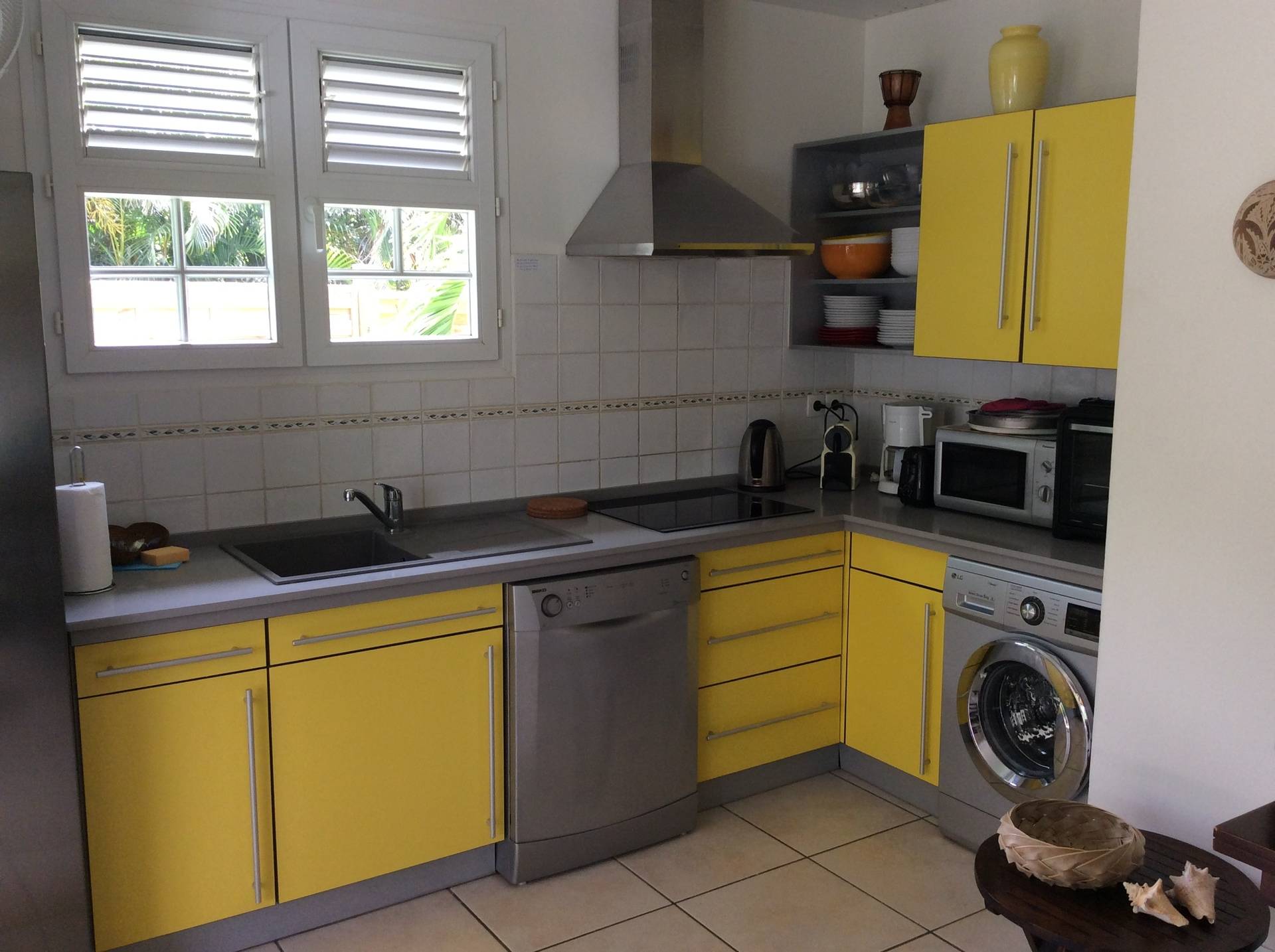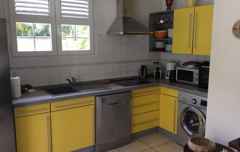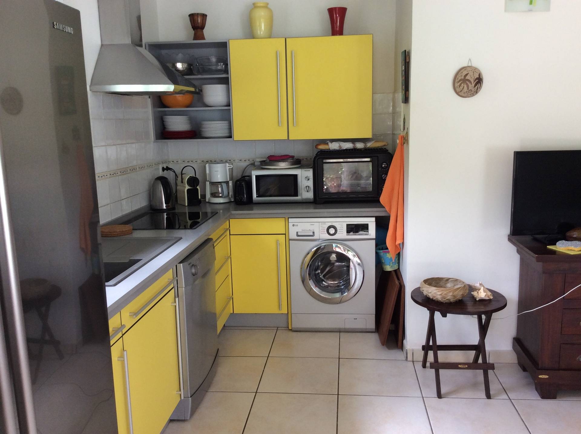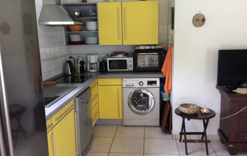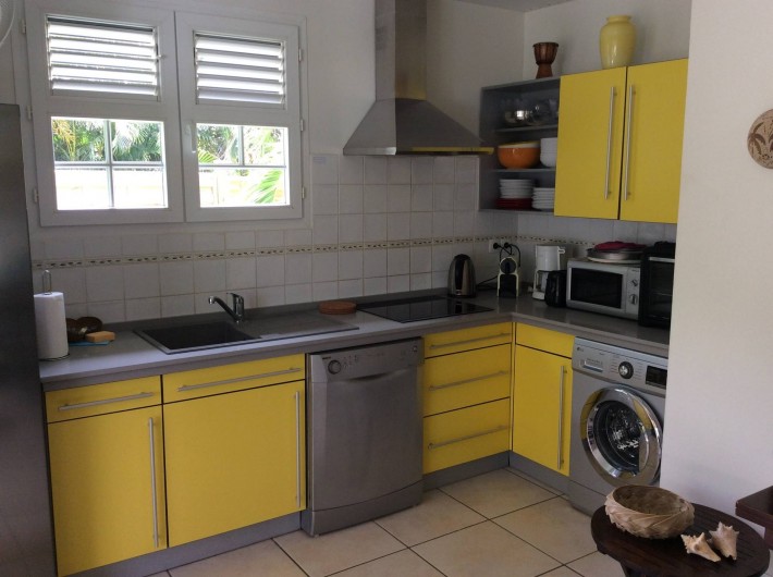 Une cuisine américaine entièrement équipée: frigo américain, lave vaisselle, lave linge, plaque de cuisson vitro céramique, four multi fonction, micro onde, hotte, cafetière, grille pain, bouilloire, robot, vaisselle et accessoires divers...etc.