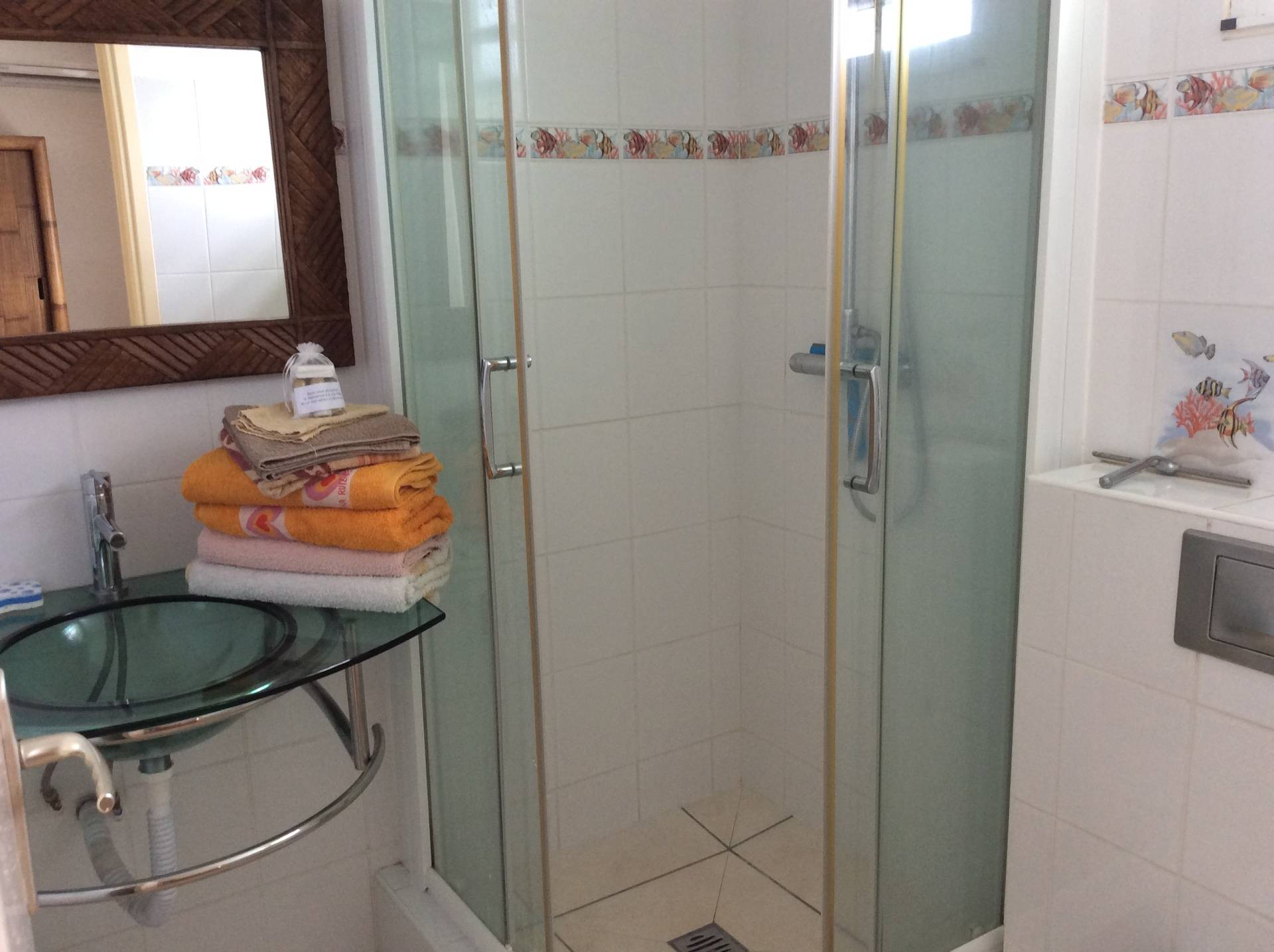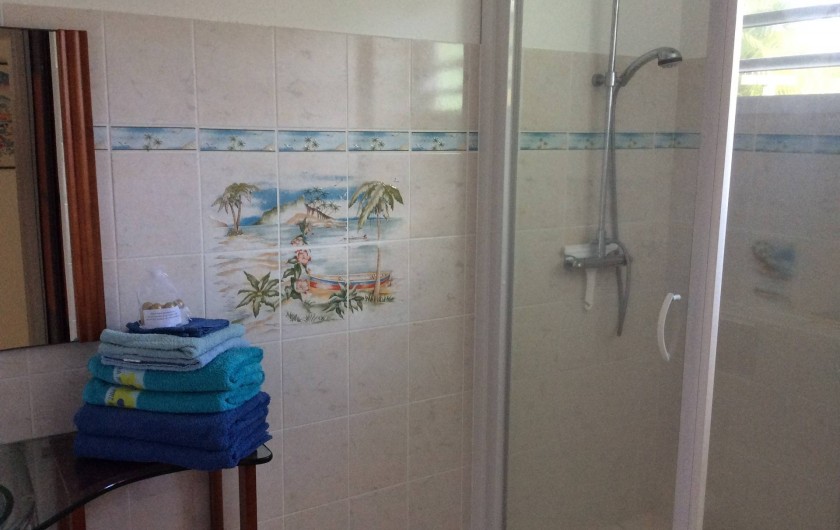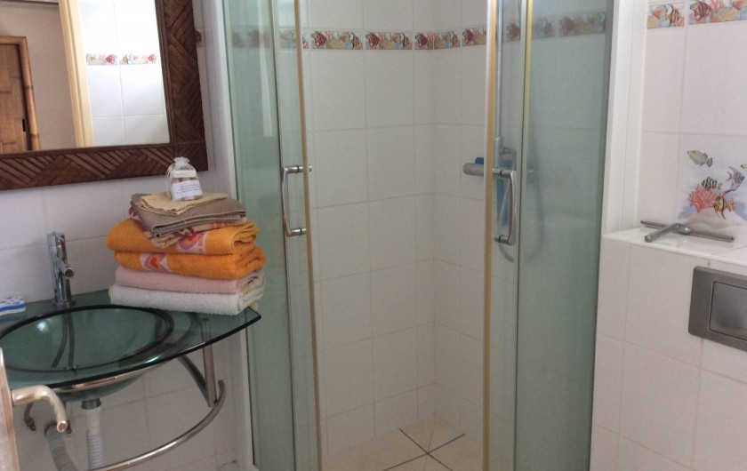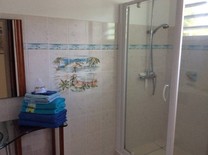 salle de bain indépendante : douche, lavabo et wc suspendu , placard de rangement.
