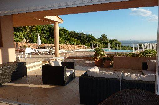 Une grande terrasse de plus de 150 m2 entoure la piscine, une autre, plus petite, orientée nord, permet de trouver ombre et fraîcheur. La piscine à débordement vient compléter cet ensemble. En position dominante, la villa vous
