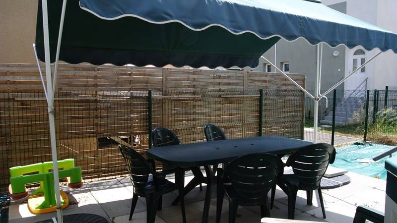 Terrasse équipée d'un barbecue et d'une table avec 6 chaises