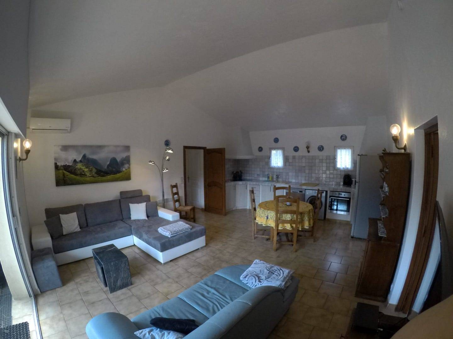 Dans le grand espace habitable et la cuisine il y a une table à manger, un grand canapé rembourré ainsi qu'un téléviseur et un distributeur à musique. La cuisine est bien équipé et dispose d'une machine à laver la vaisselle, une machine à café et ainsi une machine à laver.