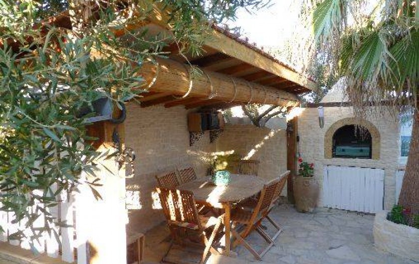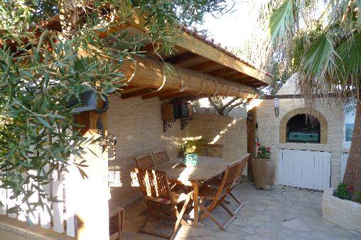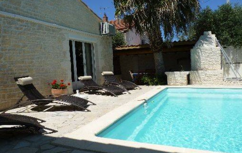 Extérieur : Cours arborée avec Piscine sécurisée 6X3, salon de jardin, bains de soleil, barbecue à gaz, parasol...etc...