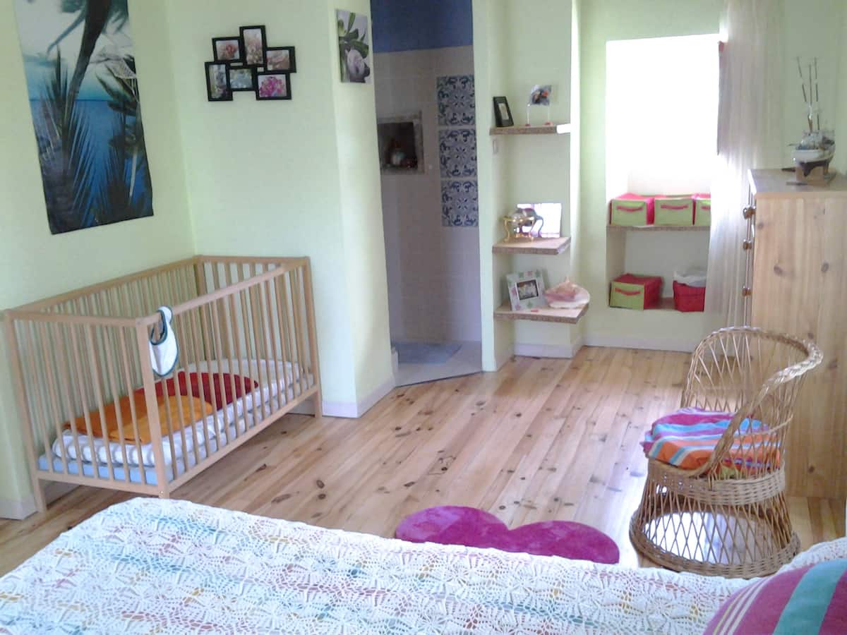 La petite maison est équipée d’une chambre avec sa petite salle d’eau, un lit 140 et un lit bébé.