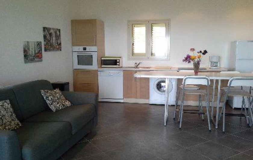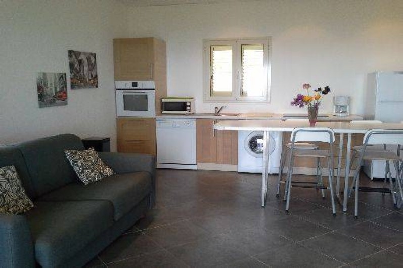 la villa avec sa terrasse couverte et son jardin privatif est composée de 2 chambres, d'une salle de bains équipée d'une douche, de toilettes séparées et d'une cuisine américaine tout équipée