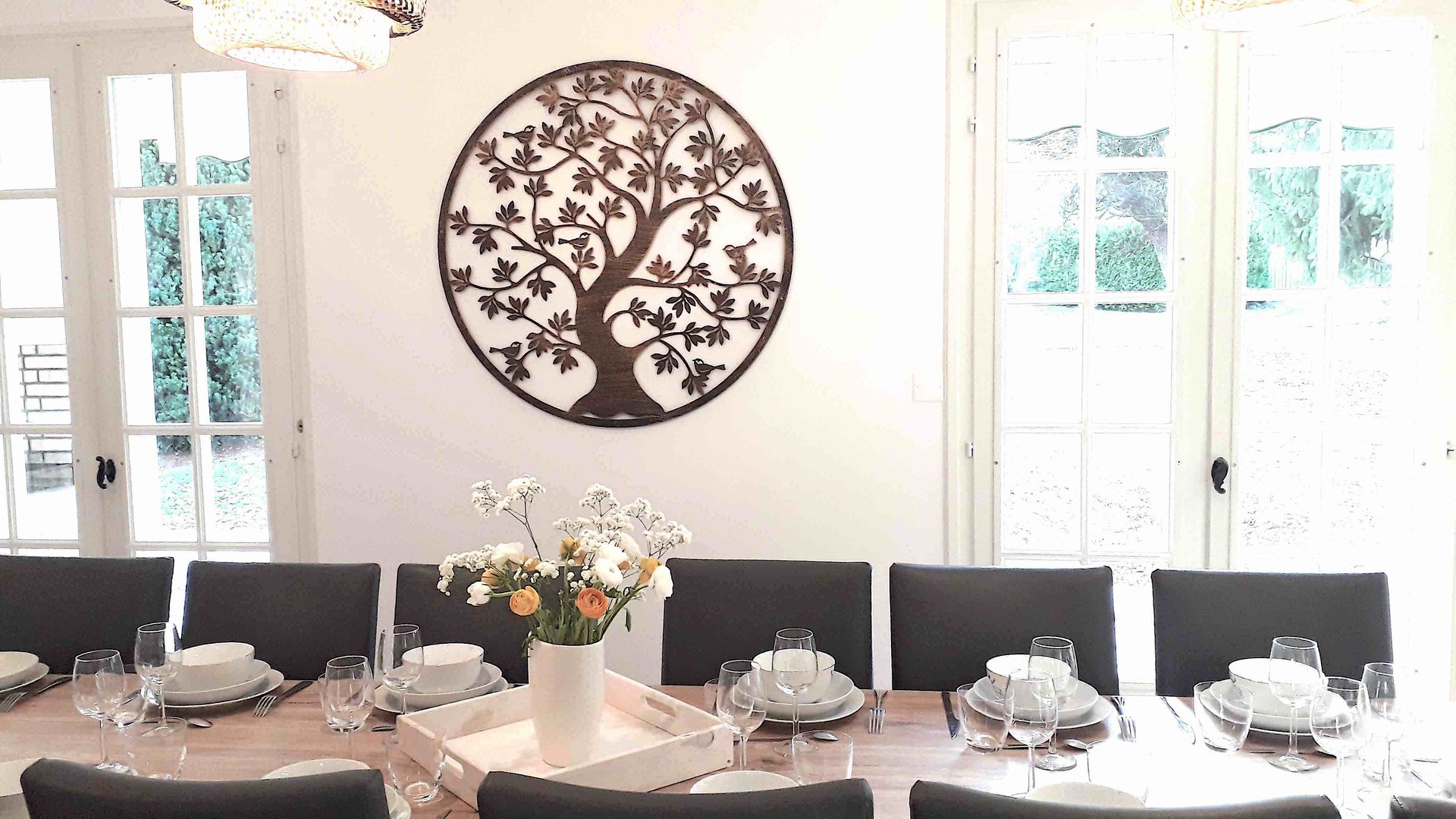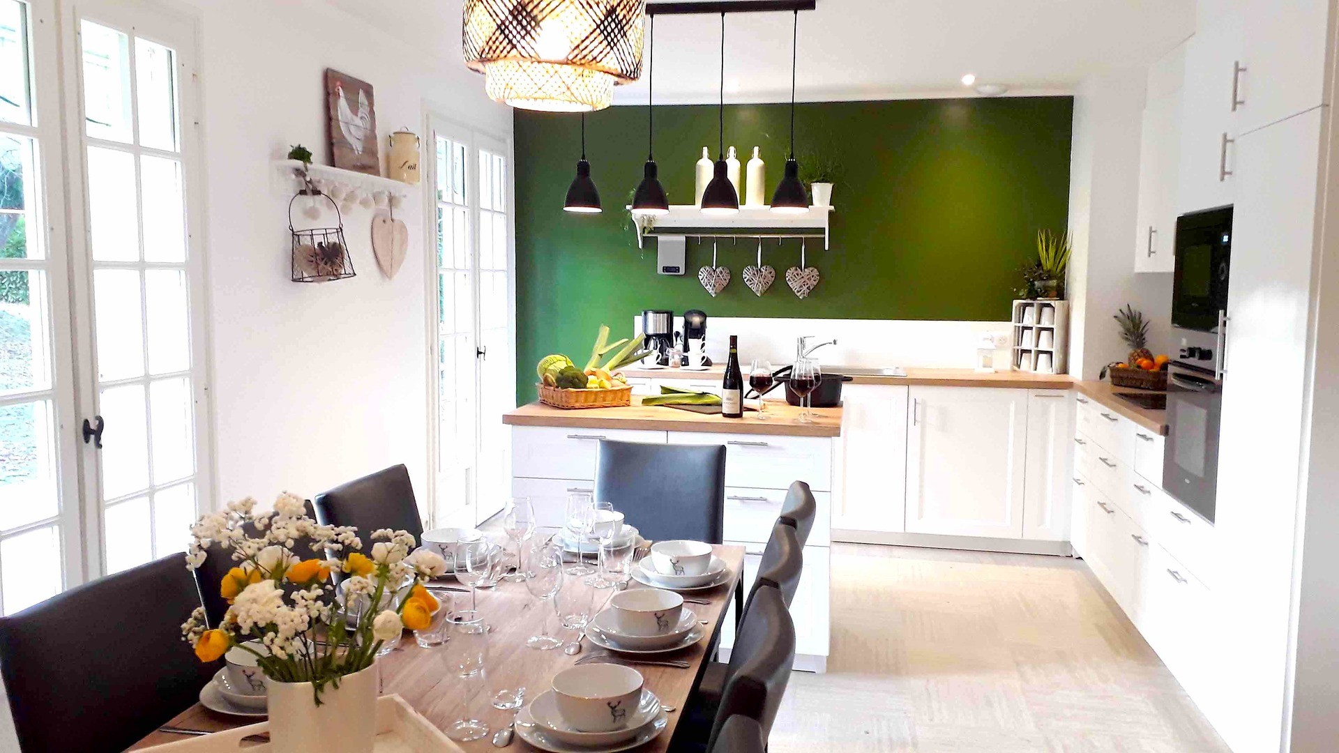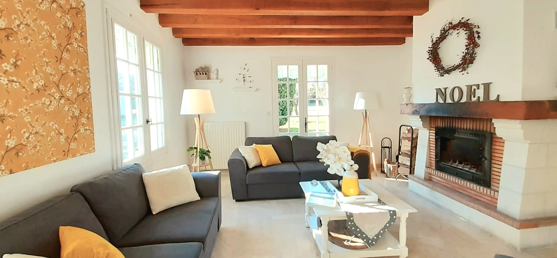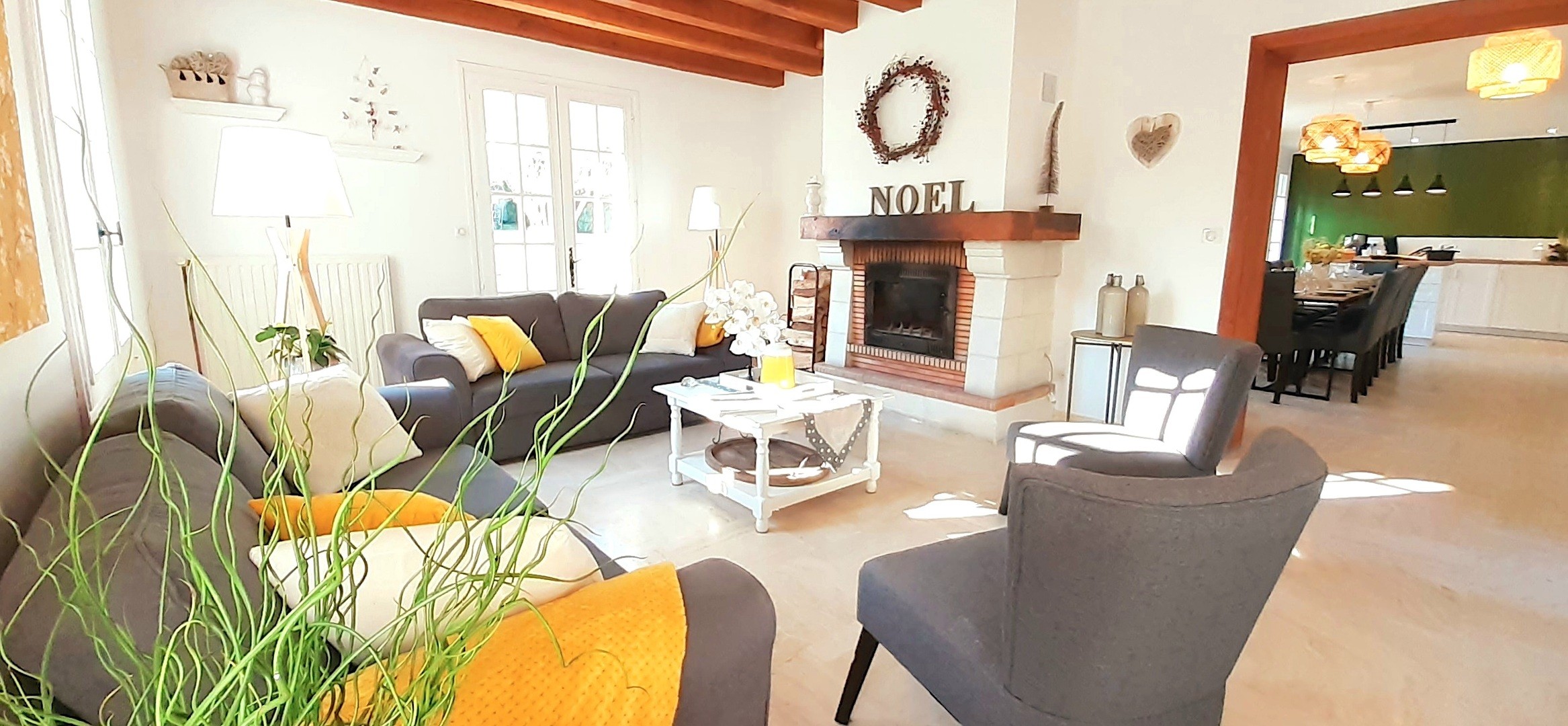 La pièce de vie est lumineuse et spacieuse ouverte sur l'extérieure, avec cuisine équipée, salle à manger pour 15 personnes et salon avec cheminée.