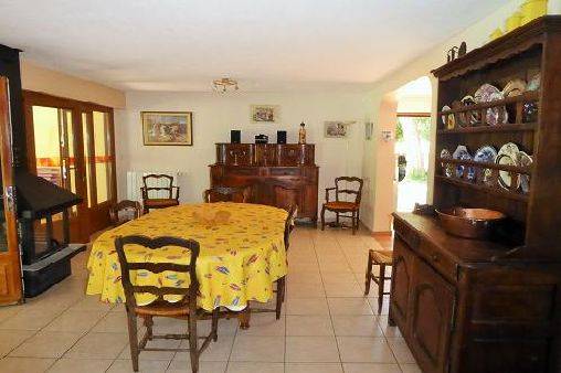 Terrasse de 66 m² (possibilité d'éclairage le soir) en prolongement du séjour et donnant sur la piscine, meubles de jardin, transats, bain de soleil, barbecue.