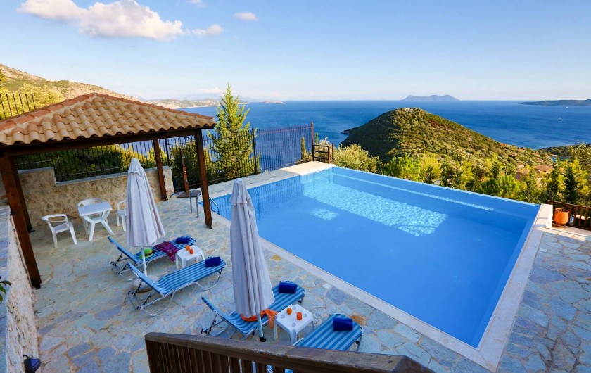Il ya une grande piscine privée de 2,60 m de profondeur (9m x 7,5m) avec évacuateur de crues, une douche extérieure et une vue extraordinaire sur la mer. Des transats et des parasols confortables pour des vacances reposantes et agréables à la piscine sont disponibles. Gazeebo extérieur (pergola) pour se détendre à l'ombre est fourni pour ces jours ensoleillés paresseux.
