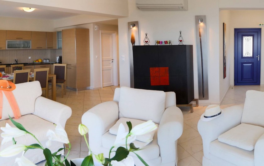 Il est équipé d'un réfrigérateur, d'une cuisinière électrique, d'un lave-vaisselle, d'une cafetière, d'un grille-pain, d'une bouilloire et d'un four à micro-ondes. Il est entièrement équipé avec ustensiles de cuisine et vaisselle. La cuisine est liée à la grande salle à manger avec vue sur la mer.