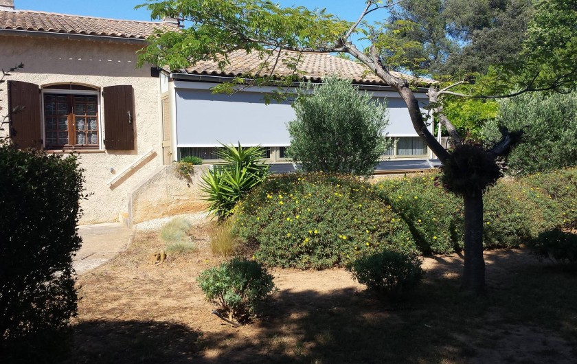 1 véranda couverte donnant sur le jardin dotée d'une table et de chaises,