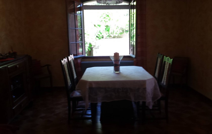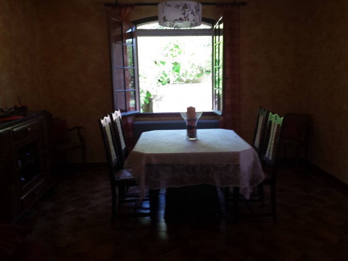 1 salle à manger avec table + chaises et un bahut renfermant de la vaisselle.