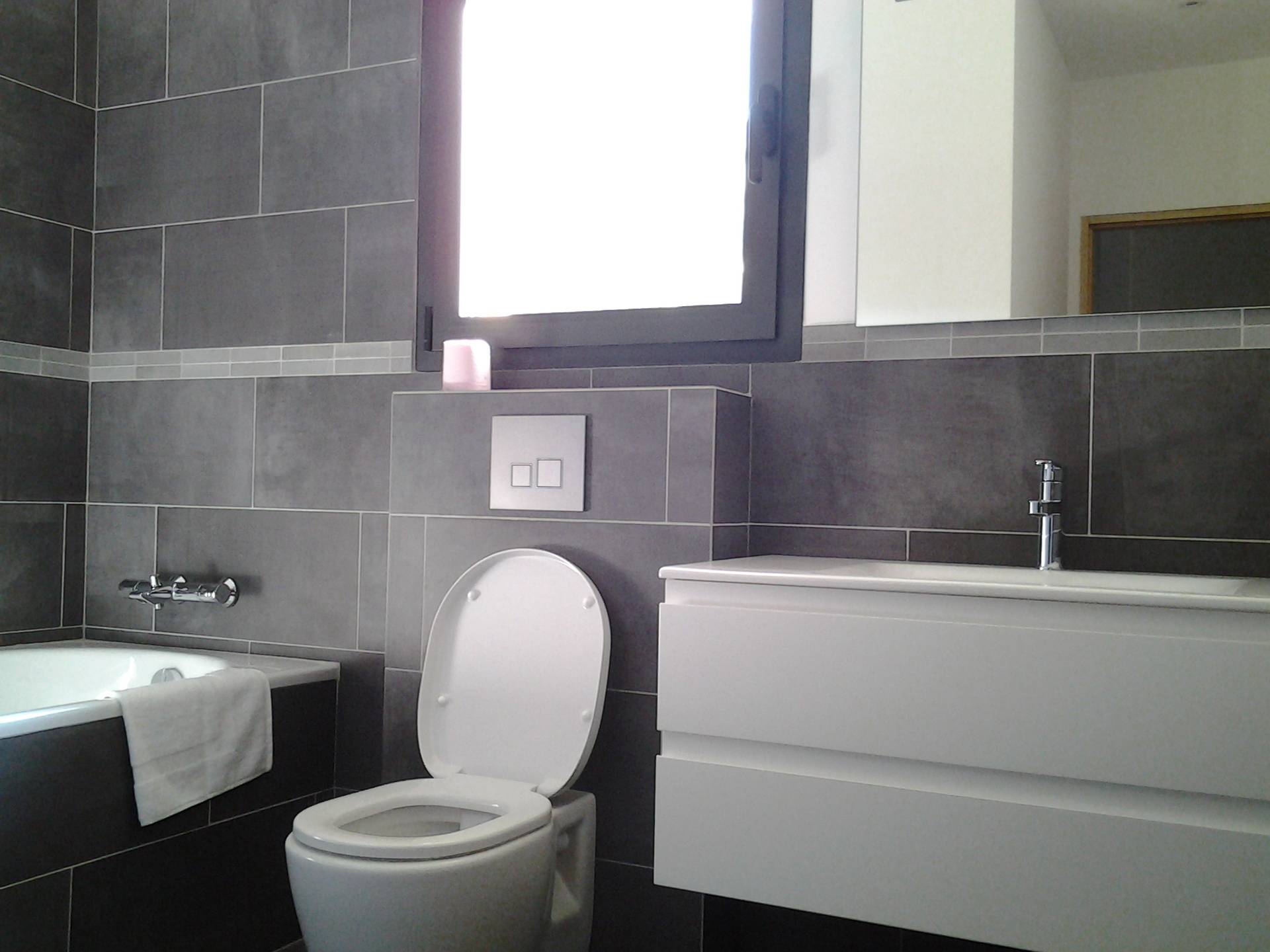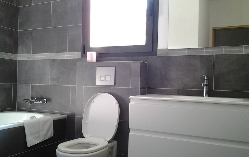 Une salle de bain avec baignoire et WC. Sèche cheveux.
