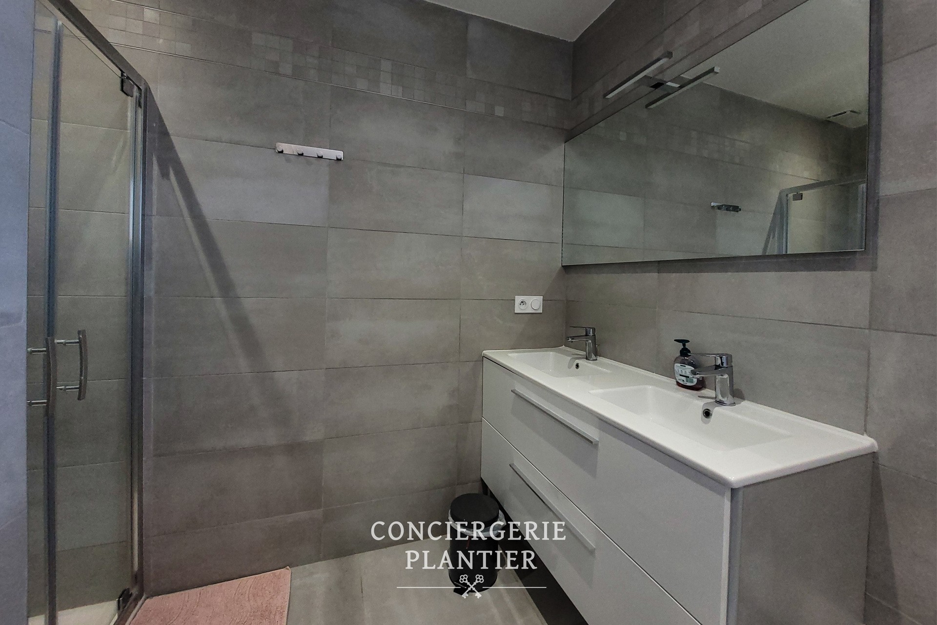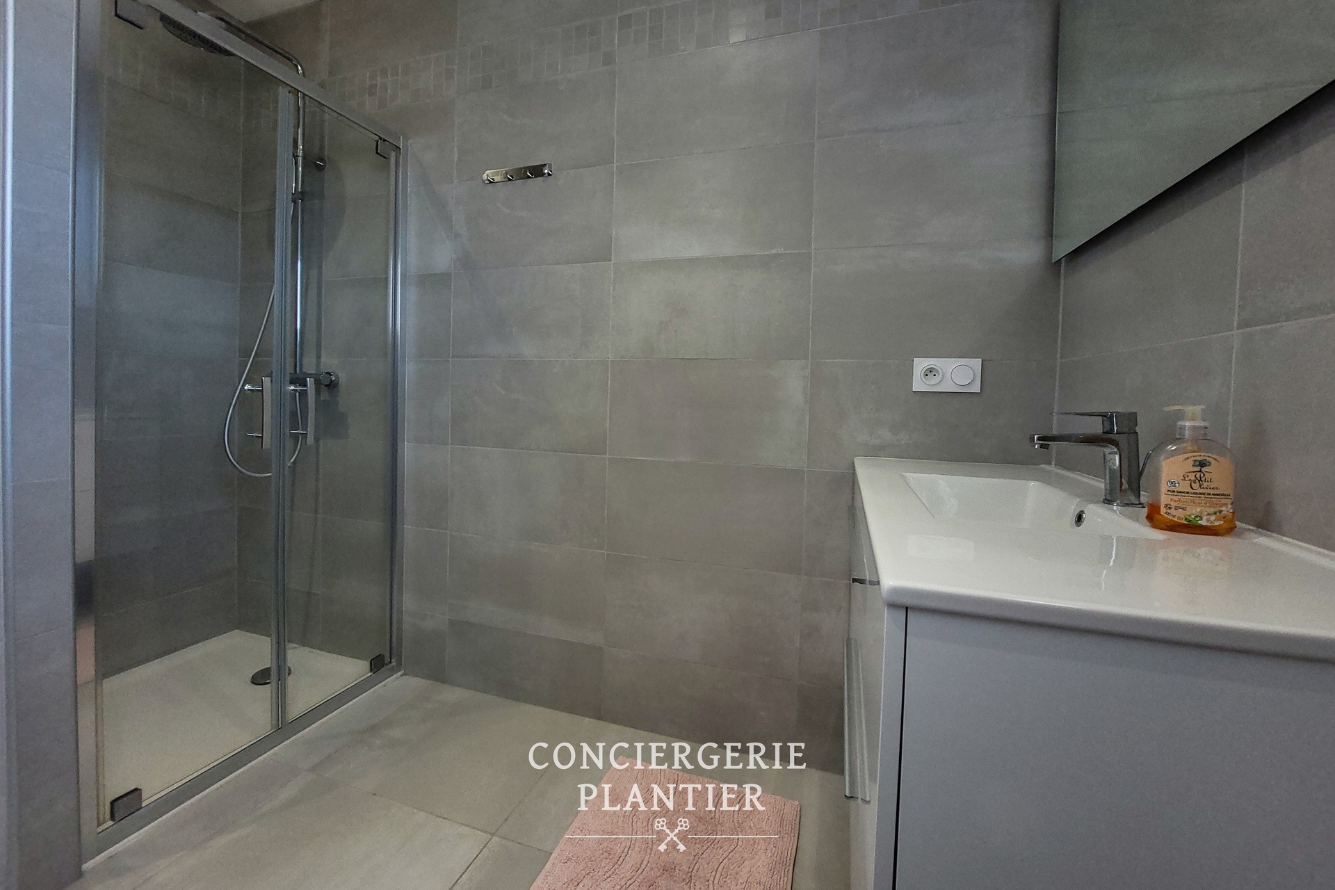 De plein pied, cuisine très bien équipée avec cellier, grand salon-séjour, 2 chambres l'une avec 2 lits en 90, l'autre 1 lit en 160, 1 SDB (baignoire, douche, double vasque),1 suite parentale 1 lit en 140 avec SDE (douche, vasque et wc). Toutes les chambres sont équipées de placard. 1 wc indépendant.