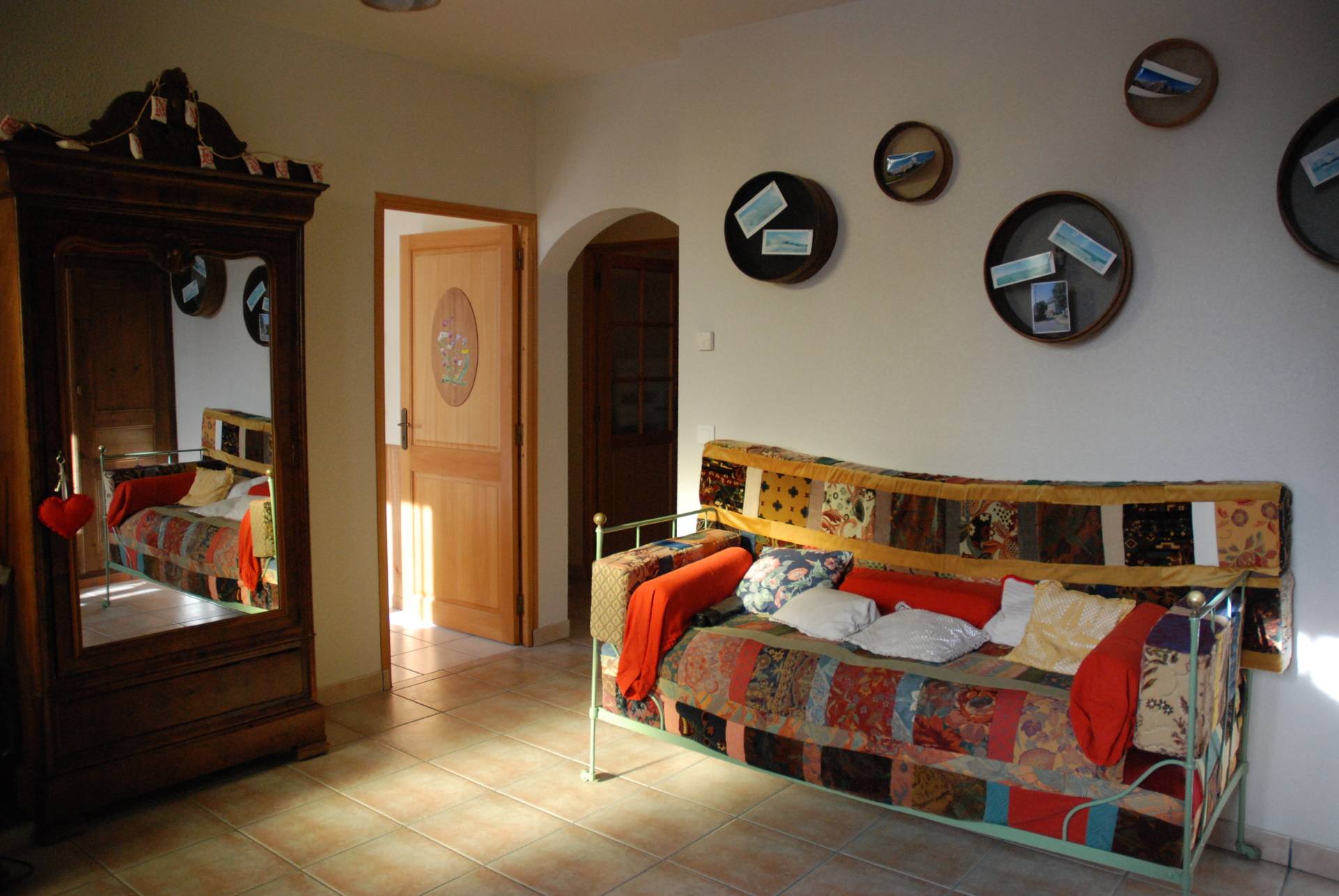 Cette pièce est surplombée d’une grande mezzanine, zone de jeux ou de lecture équipée d’un lit double en 140x190.