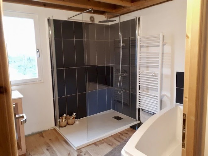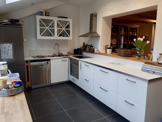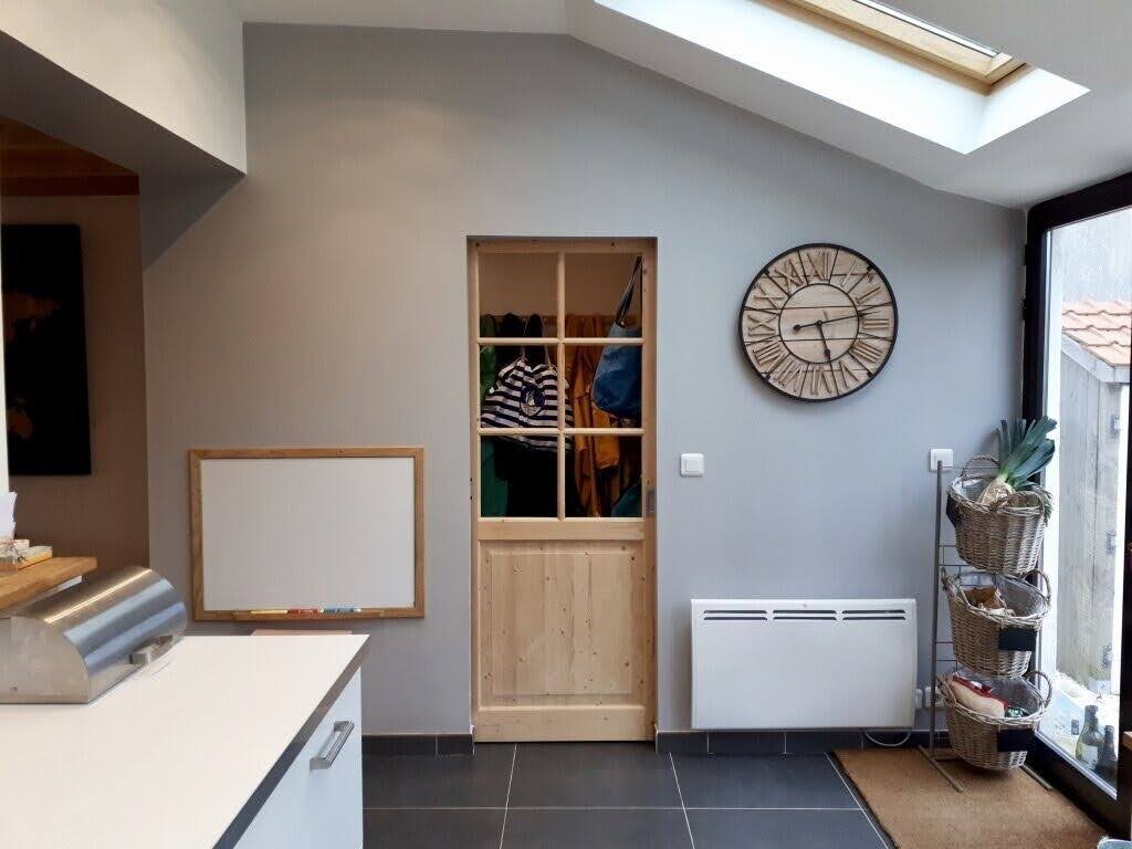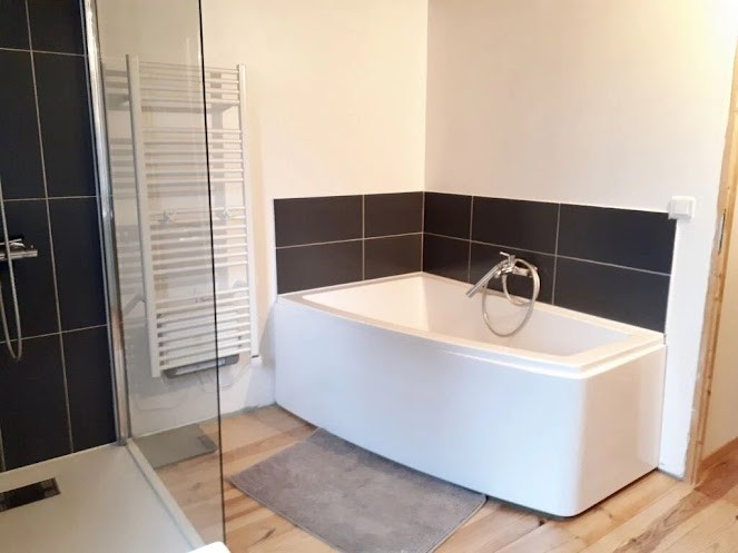 Recently renovated house which includes on the ground floor, the kitchen open to a large bright living room and the dining room. On the 1st floor, 2 good sized bedrooms, 1 spacious bathroom with tub and shower. On the 2nd floor, a large bedroom on the sloping floor.